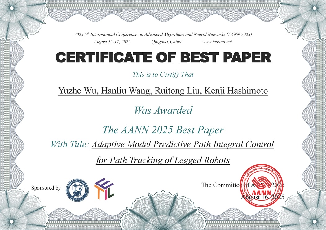 - Yuzhe Wu, Hanliu Wang, Ruitong Liu, and Kenji Hashimoto, “Adaptive Model Predictive Path Integral Control for Path Tracking of Legged Robots,” Proceedings of the 2025 5th International Conference on Advanced Algorithms and Neural Networks (AANN 2025), pp. ***-***, Qingdao, China, August, 2025.