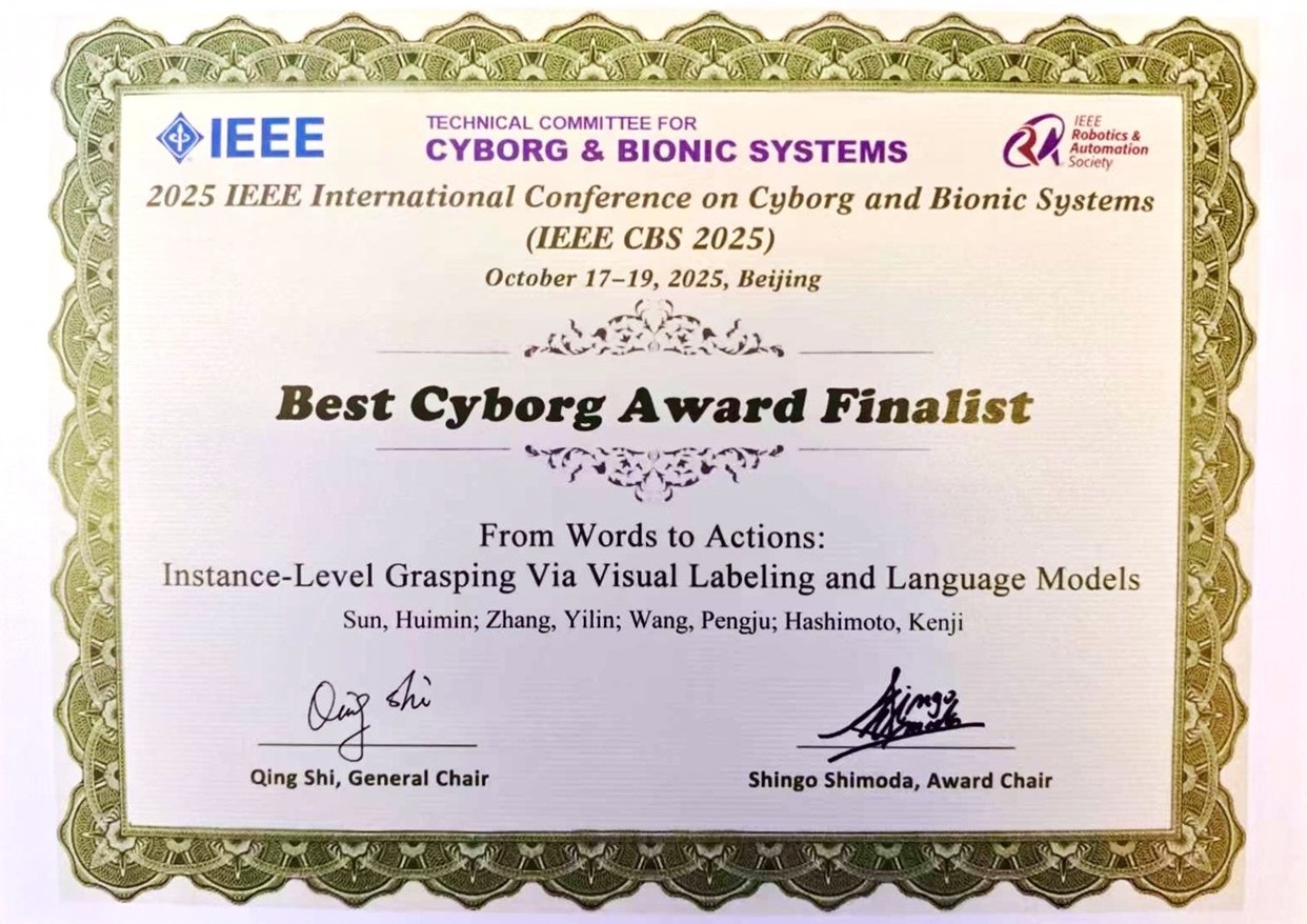 - Huimin Sun, Yilin Zhang, Pengju Wang, and Kenji Hashimoto, “From Words to Actions: Instance-Level Grasping via Visual Labeling and Language Models,” Proceedings of the 2025 IEEE International Conference on Cyborg and Bionic Systems (CBS 2025), pp. 25-30, Beijing, China, October, 2025.