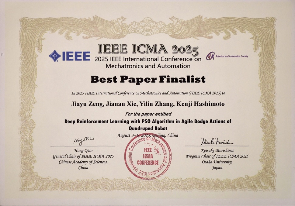 - Jiayu Zeng, Jianan Xie, Yilin Zhang, and Kenji Hashimoto, “Deep Reinforcement Learning with PSO Algorithm in Agile Dodge Actions of Quadruped Robot,” Proceedings of the 2025 IEEE International Conference on Mechatronics and Automation (ICMA 2025), pp. 261-266, Beijing, China, August, 2025.